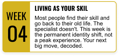 Most people find their skill and go back to their old life. The specialist doesn't. This week is the permanent identity shift, not a peak experience. Your next big move, decoded.