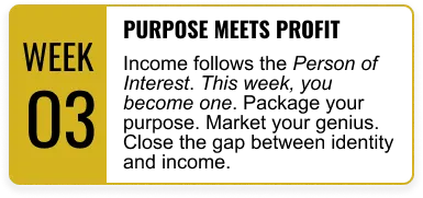 Income follows the Person of Interest. This week, you become one. Package your purpose. Market your genius. Close the gap between identity and income.